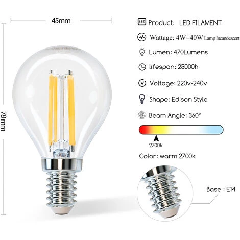 Recensisci per primo “Aigostar Lampadine A Filamento LED E14,Luce Calda 2700K, 4W,Equivalenti A 40 W, 470 Lumen, Angolo Di Apertura: 360°,Non Dimmerabile,G45,Confezione Da 5 Unità” Annulla risposta