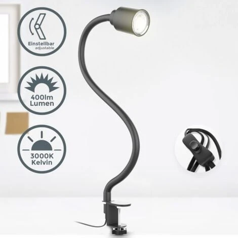 Luce regolabile: la lampada a morsetto nera opaca può essere ruotata e ruotata di 360° e offre quindi possibilità di illuminazione individuale. La lampadina da 5W brilla in un caldo colore di luce bianca.