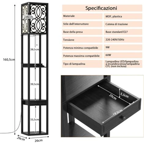 Ampio Spazio: Con 1 pratico cassetto con maniglia e 3 ripiani aperti, questa lampada a piantana offre tanto spazio per sistemare diversi oggetti come telecomando, foto e riviste, così la stanza rimarrà pulita e ordinata. Inoltre, c’è un sistema che mantiene i cavi in ordine.