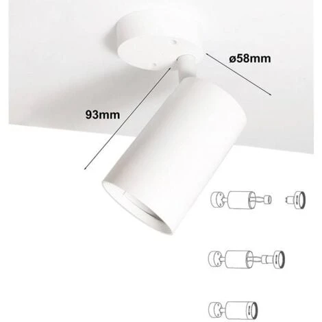 Fari LED regolabili in finitura nera o bianca. Con attacco GU10, la lampadina non è inclusa. Possono essere installati su pareti e soffitti. Con un design moderno e un asse di rotazione per poter orientare il faretto LED in qualsiasi direzione. L’angolo del fascio è di 36 gradi. Ideale per negozi, supermercati, vetrine, centri commerciali e qualsiasi luogo interno come salotti, camere da letto, corridoi, ecc. Misure: Ø58x93mm.