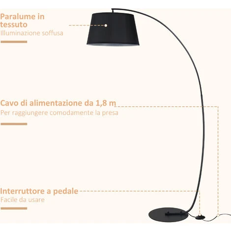 Dai alla tua casa uno stile moderno con questa lampada da terra HOMCOM! Perfetta per il soggiorno, la sala da pranzo, la camera da letto o il soggiorno, questa lampada diffonde una luce soffusa attraverso il paralume rivestito in lino nero. Il telaio è costruito in metallo, ed è dotato di un’ampia base rotonda per il massimo della stabilità. Grazie al suo look total black, questa lampada da terra è l’ideale per portare un tocco di stile nella tua casa!