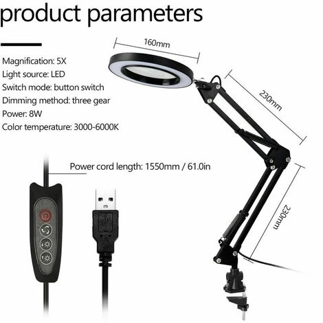 Realizzato con materiali di alta qualità, pratico, facile da usare e da usare, ampia gamma di applicazioni, lunga durata. Caratteristiche: Luce a LED da tavolo e lente d’ingrandimento 2 in 1, lente d’ingrandimento con luce a LED, che ti dà abbastanza luce di notte senza accendere le luci sopraelevate. Tre modalità di regolazione della luminosità (luce calda, luce naturale, luce bianca) soddisfano una varietà di esigenze e diverse temperature di colore possono essere selezionate in base alle diverse occasioni. 10 livelli di luminosità possono darti cure diverse. Portalampada in metallo, rapida dissipazione del calore, 0 pericolo, 0 flash. Le luci sono prive di fantasmi, morbide e uniformi e piacevoli per gli occhi. La lampada può essere ruotata di 360°, il supporto può essere regolato di 180°. Alimentato dall’interfaccia USB, compatibile con una varietà di metodi di alimentazione: computer, adattatore, power bank, ecc. La lente d’ingrandimento della lampada 5X può essere utilizzata in uffici, scuole, laboratori, uffici, camere da letto, ecc., più precisa e più conveniente nel tuo studio e lavoro. Specifiche: Materiale principale: metallo Colore: nero, bianco (opzionale) Tipo: presa, morsetto a C (opzionale) Ingrandimento: 5X Sorgente luminosa: LED Modalità di commutazione: interruttore a pulsante Metodo di regolazione della luminosità: tre marce Potenza: 8 W Temperatura colore: 3000- 6000 K Lunghezza del cavo di alimentazione: 1550 mm / 61,0 pollici Diametro lampada: 160 mm / 6,3 pollici Max. Intervallo di serraggio del morsetto a C: 47 mm / 1,9 pollici Diametro presa: 155 mm / 6,1 pollici Peso articolo: Tipo presa: 1342 g / 3,0 libbre Tipo morsetto C: 599 g / 1,3 libbre Confezione: 300 * 270 * 90 mm / 11,8 * 10,6 * 3,5 pollici Peso confezione: Tipo base: 1580 g / 3,5 libbre C Tipo di morsetto: 837 g / 1,8 libbre