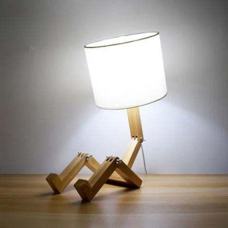Lampada da tavolo fatta di legno con un design da bambola, che si può modellare muovendo le sue diverse articolazioni. Dotato di una presa per lampadine E27 LED e di un paralume in tessuto bianco. Include un cavo tessile decorativo arancione con interruttore.