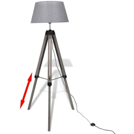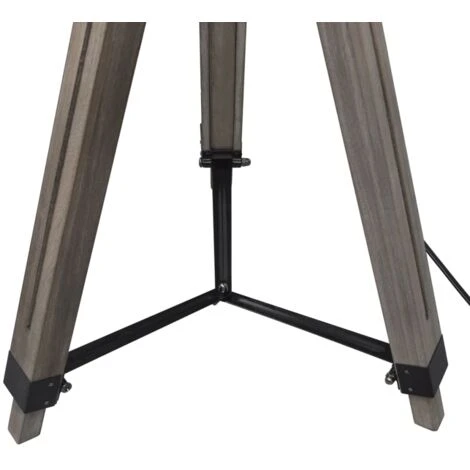 Questa lampada da terra moderna, in stile contemporaneo ha una base lavorata in legno a forma di treppiede ed un paralume circolare grande, segue lo stile industriale, alla moda oggi.