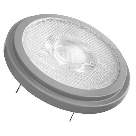 Lampada LED AR111 PRO 75 DIM 11.7W/930 G53 800lm 40º. Lampade LED AR111 con riflettore a bassa tensione con attacco a perno. Caratteristiche del prodotto: Alternativa LED per lampade alogene a bassa tensione. Elevata consistenza del colore: ? 4 SDCM. Dimmerabile. Boccola: G53. Ottima resa cromatica (Ra: 97). Durata: fino a 40.000 ore. Vantaggi del prodotto: sostituzione rapida, semplice e sicura senza ricablaggio. Design, dimensioni e flusso luminoso paragonabili a quelli di una lampada a incandescenza o alogena. Bassi costi di manutenzione grazie alla lunga durata. Nessuna radiazione UV o vicino a radiazione di tipo IR nel raggio di luce. Oscuramento continuo. Alta compatibilità con i dimmer, vedi anche www.ledvance.com/dim. Compatibile con molti comuni alimentatori elettronici e convenzionali (vedi Elenco compatibilità).