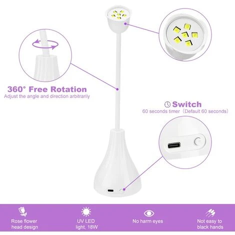 【Design alla moda】La lampada per unghie è progettata con una testa di rosa , squisito, nuovo e alla moda. Design del supporto a collo d’oca, può essere ruotato di 360° liberamente, puoi regolare qualsiasi angolo tu voglia. Il supporto per luce aperto può risolvere facilmente il problema dell’illuminazione irregolare delle unghie e alleviare le tue preoccupazioni.
