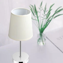 Lampada Da Tavolo Lume Da Comodino Abatjour Acciaio Cromato E Tessuto Beige