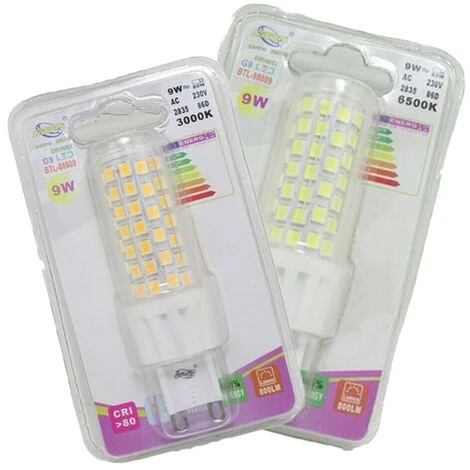 Lampadina LED BTL-96009 con potenza di 9W e attacco G9. Forma tubolare in materiale termoplastico. Fascio luminoso di 360° e flusso luminoso di 800 lm. Questa lampadina ad alta luminosità, ha un rapporto di circa 90 lm/W. La potenza di 9W è equivalente a 80W di una lampadina a incandescenza. Lampadina con tecnologia LED SMD e copertura trasparente.
