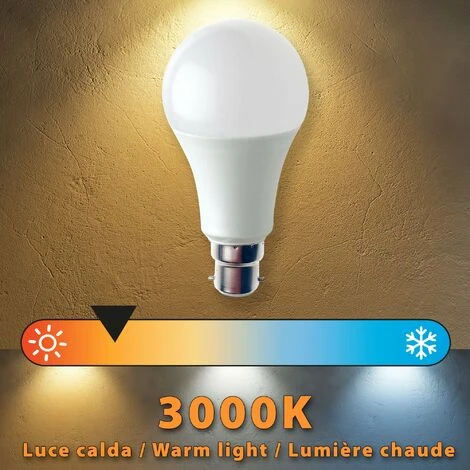 Con una vita utile di 20.000 ore (ben oltre gli standard che troverete sul mercato), la lampadina può durare oltre 15 anni (con un uso giornaliero di 3 ore). ATTENZIONE: l’attacco è B22 a baionetta , specifico per la Francia. Produce 1520 lumen di luminosità istantanea, senza bisogno di attendere il riscaldamento della lampadina. Diffusore opalizzato che rende la luce omogenea, non abbagliante, e ben diffusa (angolo 200°). Con una temperatura di colore di 3000 Kelvin, la lampadina fornisce una luce bianca calda, creando un’atmosfera confortevole in ogni stanza. Perfetta per tutte le stanze di casa come cameretta, soggiorno, bagno…e per l’ufficio. Consuma 15 watt di energia e ha un costo di funzionamento di meno di 2,50 euro l’anno e consente un risparmio energetico importante rispetto ad una lampadina incandescente. Equivalente ad una lampadina tradizionale da 100W. L’alto indice di resa cromatica (IRC > 80) offre un colore naturale e vivo. Questa lampadina non è dimmerabile, non compatibili con dimmer.