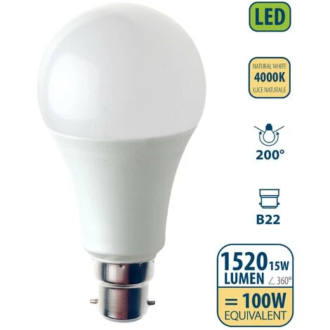 Con una vita utile di 20.000 ore (ben oltre gli standard che troverete sul mercato), la lampadina può durare oltre 15 anni (con un uso giornaliero di 3 ore). ATTENZIONE: l’attacco è B22 a baionetta , specifico per la Francia. Produce 1520 lumen di luminosità istantanea, senza bisogno di attendere il riscaldamento della lampadina. Diffusore opalizzato che rende la luce omogenea, non abbagliante, e ben diffusa (angolo 200°). Con una temperatura di colore di 4000 Kelvin, la lampadina fornisce una luce bianca naturale, creando un’atmosfera luminosa in ogni stanza. Perfetta per tutte le stanze di casa come cameretta, soggiorno, bagno…e per l’ufficio. Consuma 15 watt di energia e ha un costo di funzionamento di meno di 2,50 euro l’anno e consente un risparmio energetico importante rispetto ad una lampadina incandescente. Equivalente ad una lampadina tradizionale da 100W. L’alto indice di resa cromatica (IRC > 80) offre un colore naturale e vivo. Questa lampadina non è dimmerabile, non compatibili con dimmer.