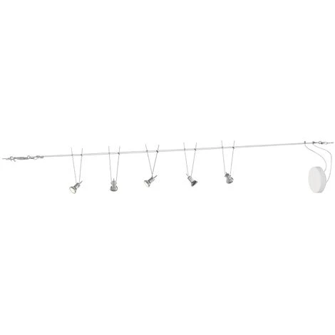 Il moderno sistema di cavi Marno si affida alla tecnologia I due cavi di questa moderna illuminazione di design corrono paralleli al soffitto, mentre cinque staffe GU5.3 pendono da essi a una distanza liberamente selezionabile. Con un sistema di cavi di questo tipo, è possibile progettare un ambiente moderno che sappia coniugare illuminazione e design futuristico. Il sistema di cavi Marno è a cinque fiamme ed è quindi particolarmente adatto a stanze di medie e grandi dimensioni. Il cavo è in acciaio e presenta un effetto cromato piacevolmente fresco. Le prese sono realizzate in plastica di alta qualità in colore argento e sono regolabili nell’angolo di inclinazione. In questo modo si ottiene un’illuminazione ideale della stanza.
