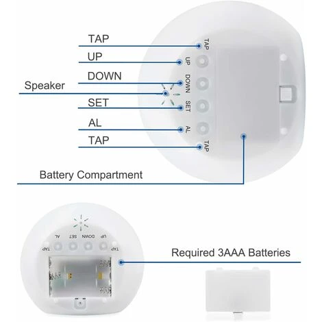 - ♪【7 colori】 Sono disponibili 7 colori (rosso, verde, viola , giallo, blu, rosa, giallo chiaro) che ruotano automaticamente. Se vuoi spegnere o accendere la retroilluminazione, premi il tasto TAP per 10 secondi rique】 Ora, data, settimana, temperatura. Supporta il formato dell’ora AM e PM. NOTA: Il “AL” situato nella parte inferiore è sensibile e fatto per interrompere la sveglia