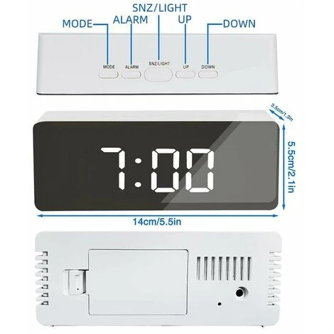 Tono di allarme Me clear, i grandi numeri bianchi e il display a specchio ti portano ottimisticamente durante la giornata.