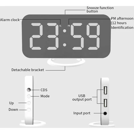 1. Funzione: display a LED, snooze, sveglia (è possibile impostare la sveglia), doppia uscita USB, memoria temporale, oscuramento automatico.