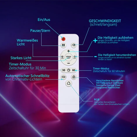 La portata del telecomando e del telefono cellulare è di 8-10 metri, la lunghezza del cavo è di 2,2 m Non è necessario lasciare il letto caldo per spegnere la lampada. Utilizza le modalità timer (30/60 minuti). L’ultimo colore separato e il livello di attenuazione rimarranno dopo lo spegnimento del led della lampada da terra, il che è conveniente per l’uso quotidiano.
