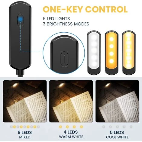 - ✦ 9 LED e 3 modalità colore: la lampada da lettura a letto ne offre 3 temperature di colore. Premere il pulsante per selezionare 3 diverse modalità colore: Bianco (5 LED bianchi), Caldo (4 LED a colori caldi), Bianco caldo (tutti i 9 LED sono accesi). Rispondi perfettamente a le tue diverse esigenze di illuminazione per leggere, lavorare o dormire.