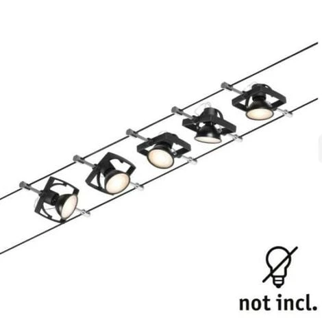 Set completo composto da trasformatore, cavo, faretti e istruzioni per l’installazioneAdatto per montaggio a parete e soffitto.Lampadine non incluse.Il cavo, con una lunghezza di 10 m, può essere separato al centro in modo che il sistema possa essere sospeso su un max. distanza di 5 m.È necessaria una sola presa di corrente per la distribuzione degli apparecchi di illuminazione in tutta la stanza. I sistemi con tecnologia a 12 V CC (corrente continua) non possono essere dimmerati utilizzando un dimmer a parete.Non adatto per il funzionamento a 12 V AC.