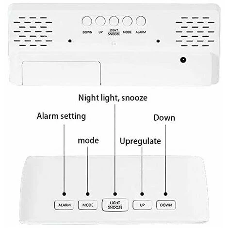 【Luminosità regolabile】 Senso visivo chiaro e confortevole, si oscura automaticamente alle 18:00. Quando è collegato con un cavo USB, la luce LED sarà sempre accesa. Quando si utilizza la modalità batteria, lo schermo si spegnerà automaticamente dopo 10 secondi. È possibile attivare lo schermo con la voce o premere un tasto qualsiasi per accendere lo schermo. Tieni premuto LIGHT/SNOOZE in qualsiasi modalità per 3 secondi per spegnere lo schermo.