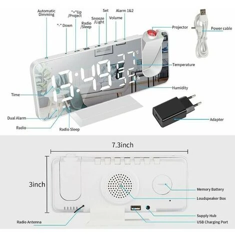 SCHERMO GRANDE 7.5″ E DISPLAY DI PROIEZIONE A 180° ULTRA CHIARO: Lo schermo della sveglia di proiezione è di 7,5 pollici e il display a LED è molto chiaro e di facile lettura. Questa sveglia digitale può ruotare la proiezione (da -90° a 90°). I numeri possono essere proiettati sul soffitto o sulla parete in qualsiasi direzione desiderata. (Sono disponibili due opzioni di luminosità.) Distanza di proiezione ottimale: entro 3,5 m. Distanza di proiezione massima: 5 m.