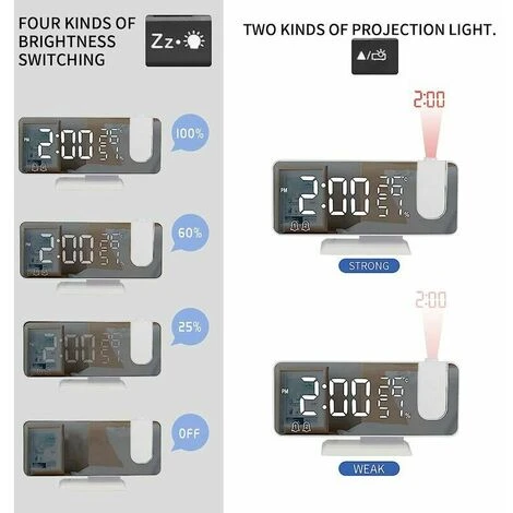 4 TIPI DI LUMINOSITÀ REGOLABILE E FUNZIONE DI DIMMERAZIONE AUTOMATICA E MODALITÀ NOTTURNA: l’orologio radio ha 4 luminosità di proiezione regolabili (chiaro – leggermente luminoso – scuro – spento). Oppure puoi anche impostare la modalità di oscuramento automatico, che può cambiare automaticamente la luminosità dello schermo in base alla luminosità dell’ambiente. Oppure puoi utilizzare la modalità notturna per impostare un basso livello di luminosità per un periodo di tempo.