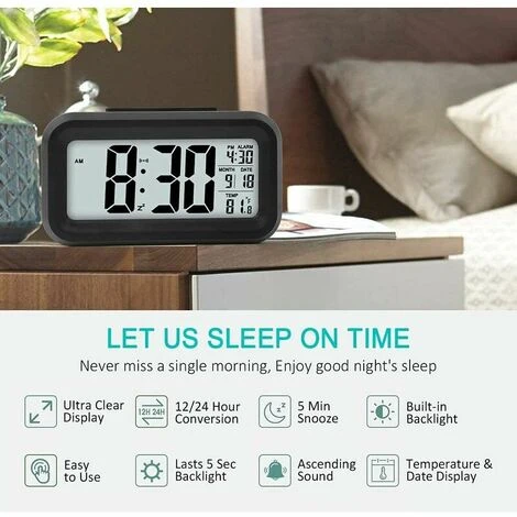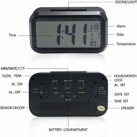 【Funzione luce intelligente】 L’orologio non si illumina durante il giorno o la stanza è sufficientemente illuminata. Quando la stanza è buia, la luce del sensore consente all’orologio di emettere automaticamente luci soffuse, perfette di notte; La luce del sensore può anche essere vicina e basta premere SNOOZE/LIGHT quando ne hai bisogno.